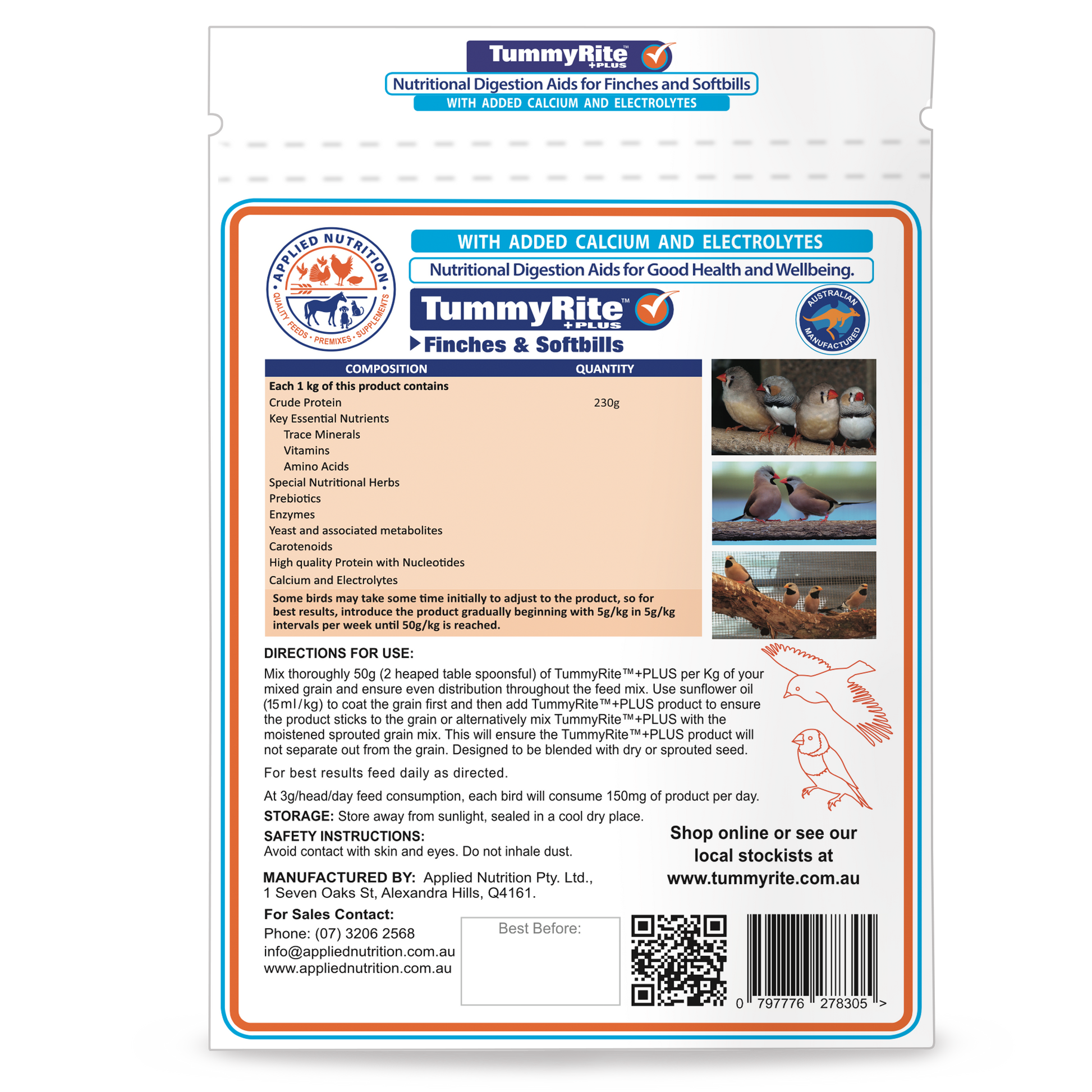 TUMMYRITE™ PLUS FOR FINCHES AND SOFTBILLS has a very low inclusion rate of 50g/kg of seed or soft food, (see brochure for details).